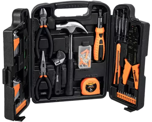 329Набор инструментов Sparta 135645 включает в себя 132 предмета для бытового применения: обжимные клещи, отвертки, в том числе для точных работ, молоток-гвоздодер, бокорезы, строительный уровень, разводной и имбусовые ключи, биты-вставки с адаптером, длинногубцы, рулетку, канцелярский нож, а также набор крепежа. Инструменты оптимально подходят для выполнения слесарно-монтажных работ дома или на даче.